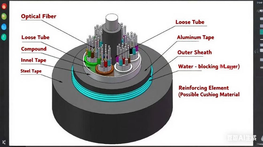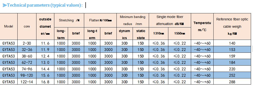 ケーブル構造は,高モジュールプラスチックで満たされた防水扭曲外殻内に収納された単モードまたは多モード光ファイバーで構成されています.コアには金属強化部品があります.特定の核数について中央の補強材の上にアルミとポリエチレンが結合した内層を外押しし,外側が折りたたみ (詰め用ロープ) でコンパクトで均質なコアを形成します.水を阻害する化合物で,内部の隙間を埋めるその後,ケーブルはアルミとポリエチレンが結合した内殻で包み,鋼糸で強化され,ポリエチレン外殻で密封されます.